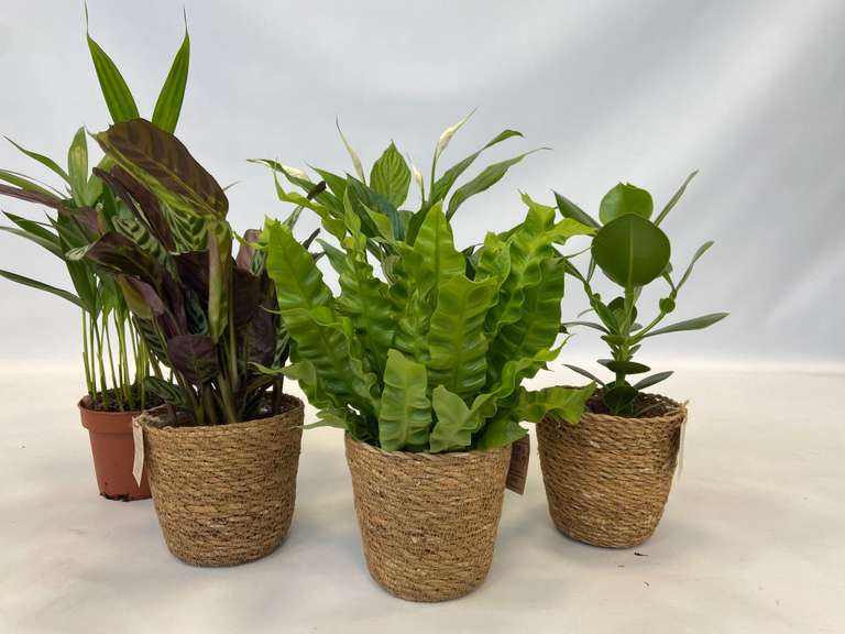 Diamètre du pot : 12 cm Ce que vous recevez : Ce set comprend cinq plantes dépolluantes : Ctenanthe burle-marxii, Pommier balsamine (Clusia rosea) 'Princess', Fougère nid d’oiseau (Asplenium) 'Crispy Wave', Areca doré (Areca lutescens) et Spathiphyllum (Lys de la paix). Fonctionnement : Les plantes absorbent, via leurs feuilles, des substances nocives présentes dans l’air, qui sont ensuite stockées et décomposées. Elles transforment également le CO2 en oxygène pendant la journée et libèrent de la vapeur d’eau, ce qui améliore l’humidité de l’air. Entretien : Arrosez régulièrement, évitez la lumière directe du soleil et maintenez une température entre 18 et 24 °C. La Ctenanthe Burle Marxii et l’Asplenium Crispy Wave n’aiment pas l’air sec. Fertilisez pendant la saison de croissance et retirez les feuilles mortes. Les paniers sont inclus.